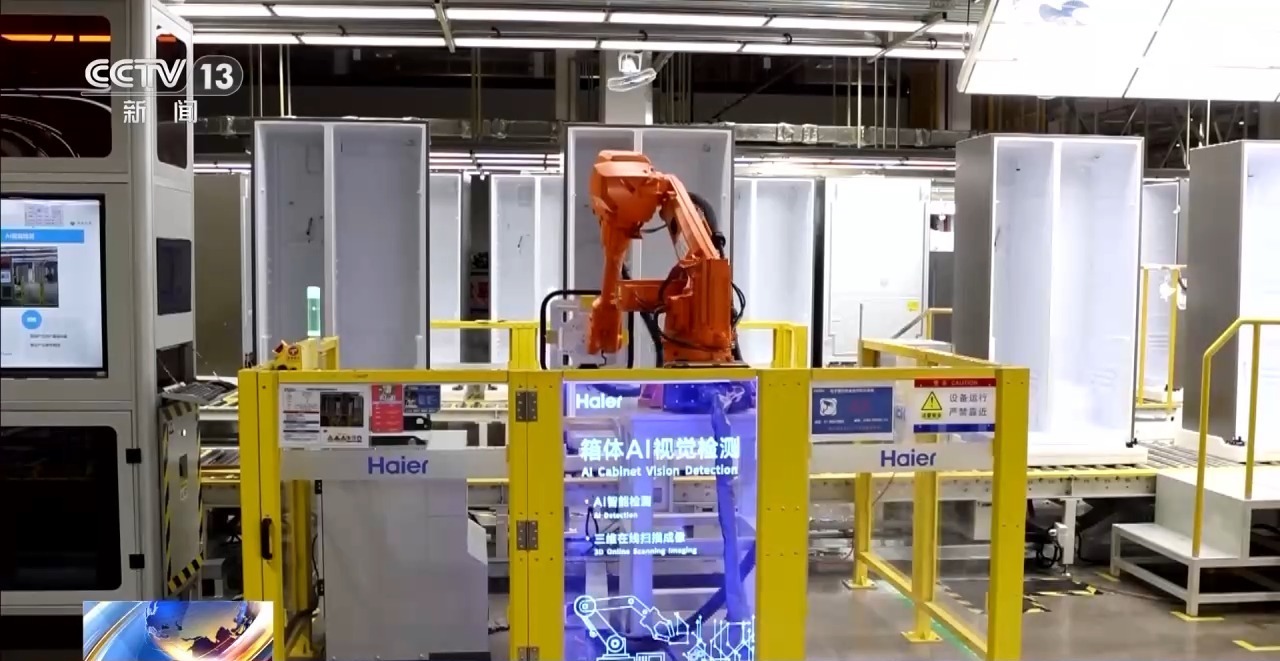 海尔工厂技术员 尹冬冬:AI的识别使检测精度提高了10倍左右,由之前的0.1毫米提升到现在的0.01毫米,生产效率提升了40%左右。